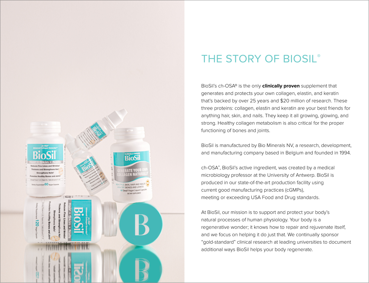 I redesigned high-use brochures and packaging for Biosil—giving the brand’s wellness roots a polished, beauty-forward presence. The updates reflected a more modern, premium look while staying grounded in the product’s science-first story.